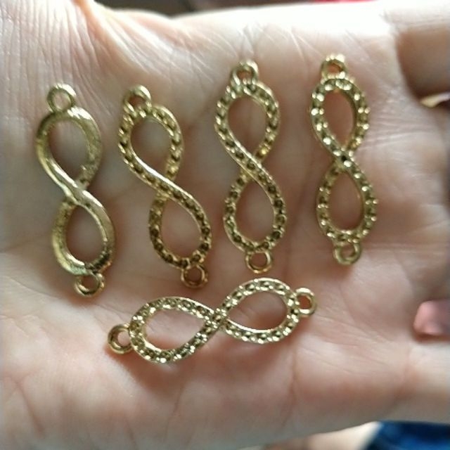 5 cái mặt số 8 có 2 lỗ treo Size :ngang 10mmx dài35mm. Kích thước lỗ xỏ 2mm. Chất liệu hợp kim mạ màu vàng đồng. Dùng làm vòng tay. Vòng cổ,trang trí túi xách.quần áo ....