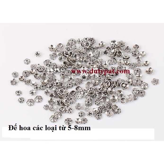 Đế hoa hỗn hợp (50g) -Chất liệu: hợp kim giả bạc cổ. -Màu bạc. -kiểu dáng: lộn xộn ngẫu nhiên -Trọng lượng: 50g/gói(khoảng trên 150-250 cái , tùy gói) Kích thước: đường kính hỗn hợp từ 5-14mm.