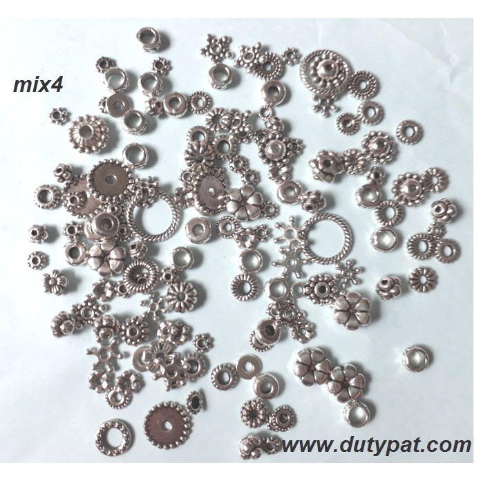 Mix4-Ống xỏ & đệm hỗn hợp (50g) -Chất liệu: kim loại. -Màu bạc. -Trọng lượng: 50g/gói(khoảng trên 150 cái, tùy gói) Kích thước: 5-10mm.