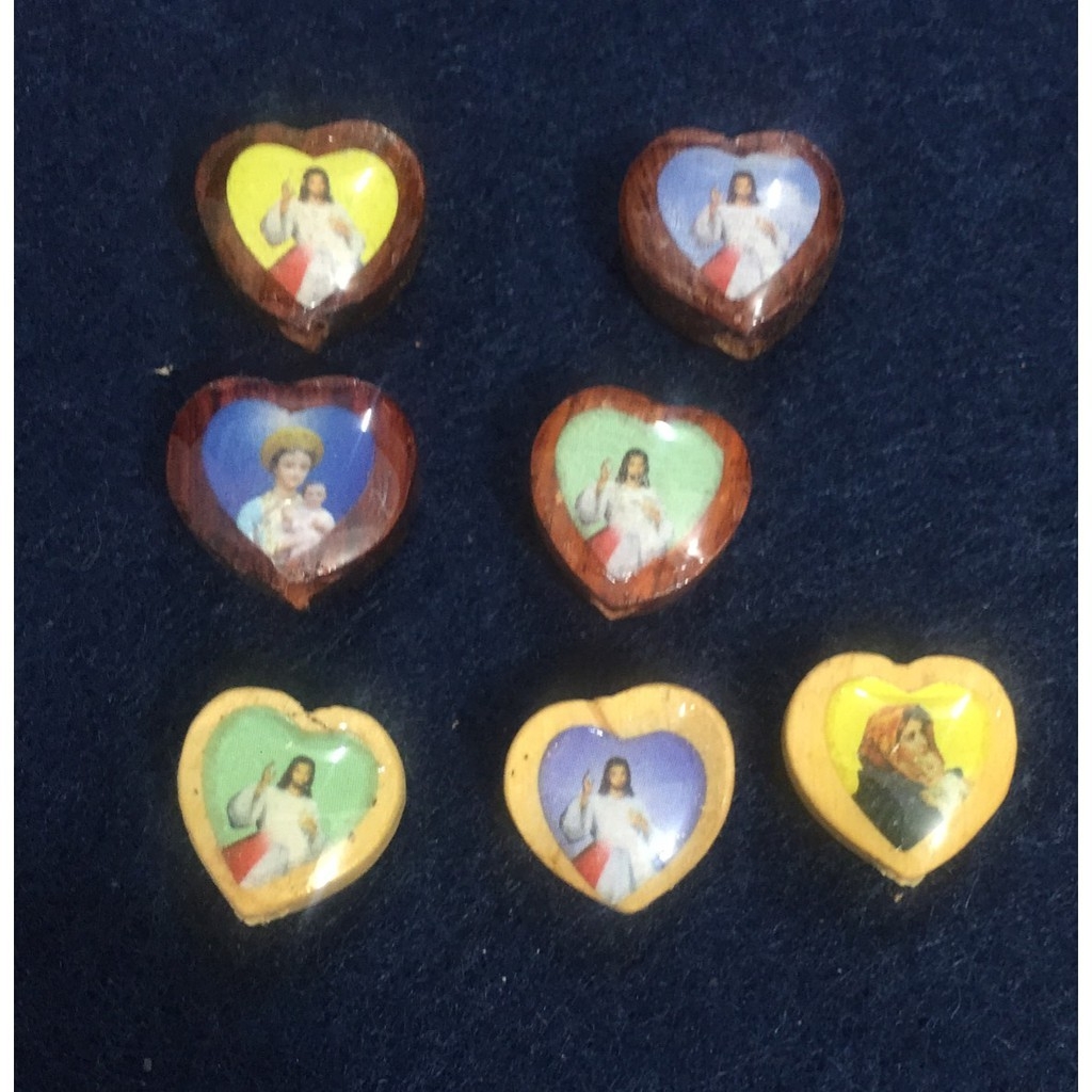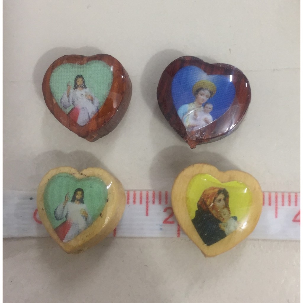 gói 2-5-10 hạt trái tim 2 lỗ gỗ xỏ vòng hình chúa Giêsu, đức mẹ 12mm
