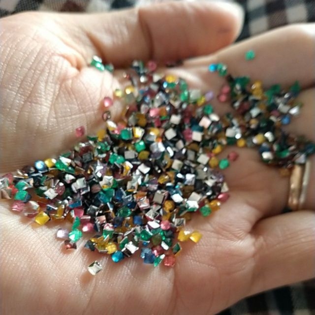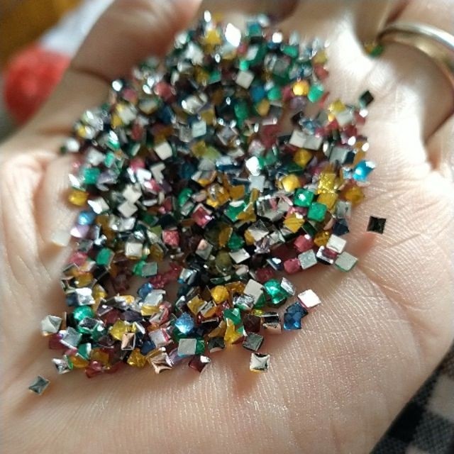 đá dán vuông cạnh 1.5mm hỗn hợp nhiều màu sử dụng kéo để dẫn ép trang trí quần áo túi xách,dán móng tùy thích. Số lượng gói nhỏ 5gam rất nhiều hạt.