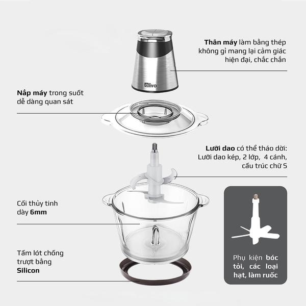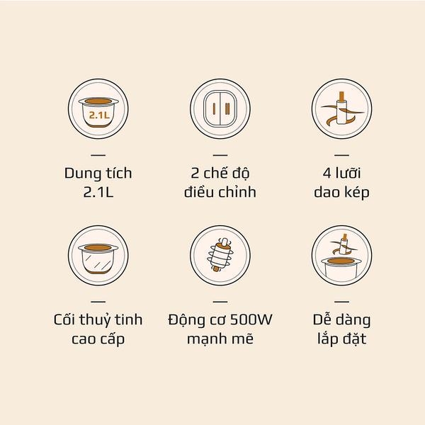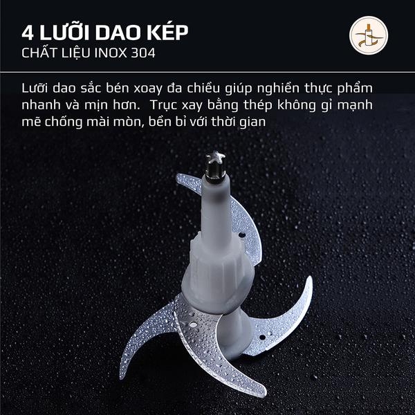 NHỮNG ƯU ĐIỂM NỔI BẬT CỦA MÁY XAY THỰC PHẨM FC21 Dung tích cối xay lên đến 2.1L có thể xay được lượng thực phẩm lớn, tương đương với 800g thịt cùng một lúc, đủ thực phẩm cho 4-6 người dùng thoải mái, tha hồ thưởng thức nhiều món ngon khác nhau. Dung tích cối xay lớn với một lần xay duy nhất, giúp các bà nội trợ bận rộn tiết kiệm được nhiều thời gian và công sức khi chế biến thực phẩm và tiết kiệm tối đa thời gian khi chuẩn bị bữa ăn. HAI CẤP ĐỘ XAY DỄ DÀNG VẬN HÀNH Công suất 500W, động cơ mạnh mẽ, hai chế độ xay I và II như sau: Cấp độ I: Bánh răng chậm thích hợp xay các thực phẩm mềm: rau củ, nấm, ớt. Cấp độ II: Bánh răng nhanh thích hợp xay các thực phẩm cứng: thịt, các loại hạt cứng, cà rốt. CHẤT LIỆU CAO CẤP - CẤU TRÚC HIỆN ĐẠI, AN TOÀN KHI SỬ DỤNG Thân máy với chất liệu INOX 304 không gỉ cao cấp an toàn sử dụng. Cối xay thủy tinh cao cấp, dày 6mm bền chắc chắn, giúp bạn dễ dàng quan sát thực phẩm khi máy đang hoạt động, dễ dàng vệ sinh sau khi sử dụng. Nắp máy làm bằng nhựa AS giúp ngăn thức ăn bắn ra ngoài, an toàn vệ sinh. Lưỡi dao được làm bằng thép 420 không gỉ, Kết cấu lưỡi dao kép có cấu trúc chữ S, lưỡi dao kép có thể dễ dàng lắp và tháo rời trong quá trình sử dụng. Các khớp nối chắc chắn và chống mài mòn tốt, an toàn khi sử dụng Động cơ vận hành êm ái, tuổi thọ cao, bền bỉ. Các khớp cố định trục xoay chắc chắn. Thân máy xay thiết kế thông minh, bề mặt vệ sinh dễ dàng. DỄ DÀNG VẬN HÀNH TRONG 4 BƯỚC: Bước 1: Đặt tấm lót chống trượt dưới đáy cối. Bước 2: Lắp trục và lưỡi dao vào cốc trộn. Bước 3: Thêm các nguyên liệu vào cốc và đậy nắp. Bước 4: Nhấn để bắt đầu, xay xong cho nguyên liệu ra để chế biến. THÁO RỜI DỄ DÀNG, THUẬN TIỆN VỆ SINH MÁY: Lưỡi dao kết hợp có thể tháo rời, khi xay số lượng thịt ít chỉ cần lắp ráp 01 lưỡi dao, khi xay số lượng thịt nhiều có thể lắp ráp 02 lưỡi dao vào cùng lúc, xay nhuyễn thực phẩm thật dễ dàng. Cối thủy tinh dễ dàng vệ sinh bề mặt, giúp cối luôn được sáng bóng, sạch sẽ đảm bảo an toàn vệ sinh thực phẩm sau khi sử dụng máy. CÔNG SUẤT MẠNH MẼ LÊN ĐẾN 500W Công suất máy lớn giúp tốc độ xay nhanh chính là ưu điểm vượt trội của máy FC21 Với lõi động cơ làm bằng dây đồng dày, giúp cải thiện hiệu suất động cơ tốt nhất. Chức năng tự động ngắt khi nhiệt cao, tránh hư hỏng động cơ và bảo vệ người dùng được an toàn. Bánh răng cao cấp giúp máy hoạt động êm ái, không gây ồn. TÍNH NĂNG ĐẶC BIỆT CHỈ CÓ TRÊN FC21 Ngoài tính năng xay thịt, các loại rau củ quả cơ bản thì FC21 vượt trội hơn với các dòng máy khác ở những tính năng cao cấp như: Bóc vỏ hành, vỏ tỏi khô …. Tách vỏ một số loại hạt cứng như hạt điều, lạc… Có thể làm được món ruốc thơm ngon. Làm các món cháo dinh dưỡng …. Đổi Trả: trong vòng 7 ngày nếu lỗi kỹ thuật. Để đủ điều kiện đổi trả, mặt hàng của bạn phải chưa được sử dụng và trong tình trạng như bạn đã nhận được. Nó cũng phải ở trong bao bì gốc. Bảo hành đông cơ lên đến 24 tháng.
