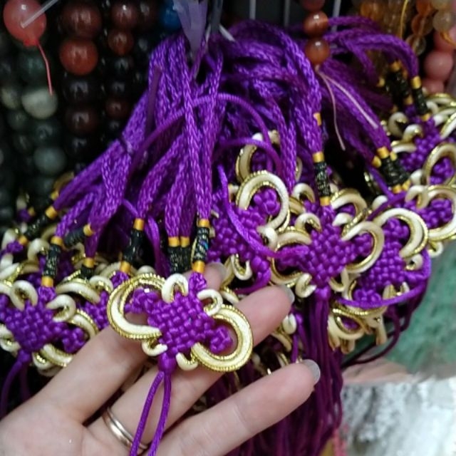dây thắt nút (dây nơ )treo phụ kiện trang trí màu tím . Kích thước sản phẩm: tổng chiều dài 35cm, chiều rộng nút 4,5cm, chiều dài nút 9cm, chiều dài dây cột 25cm Giá bán : gói 1 cái Chất liệu: dây tim polyester